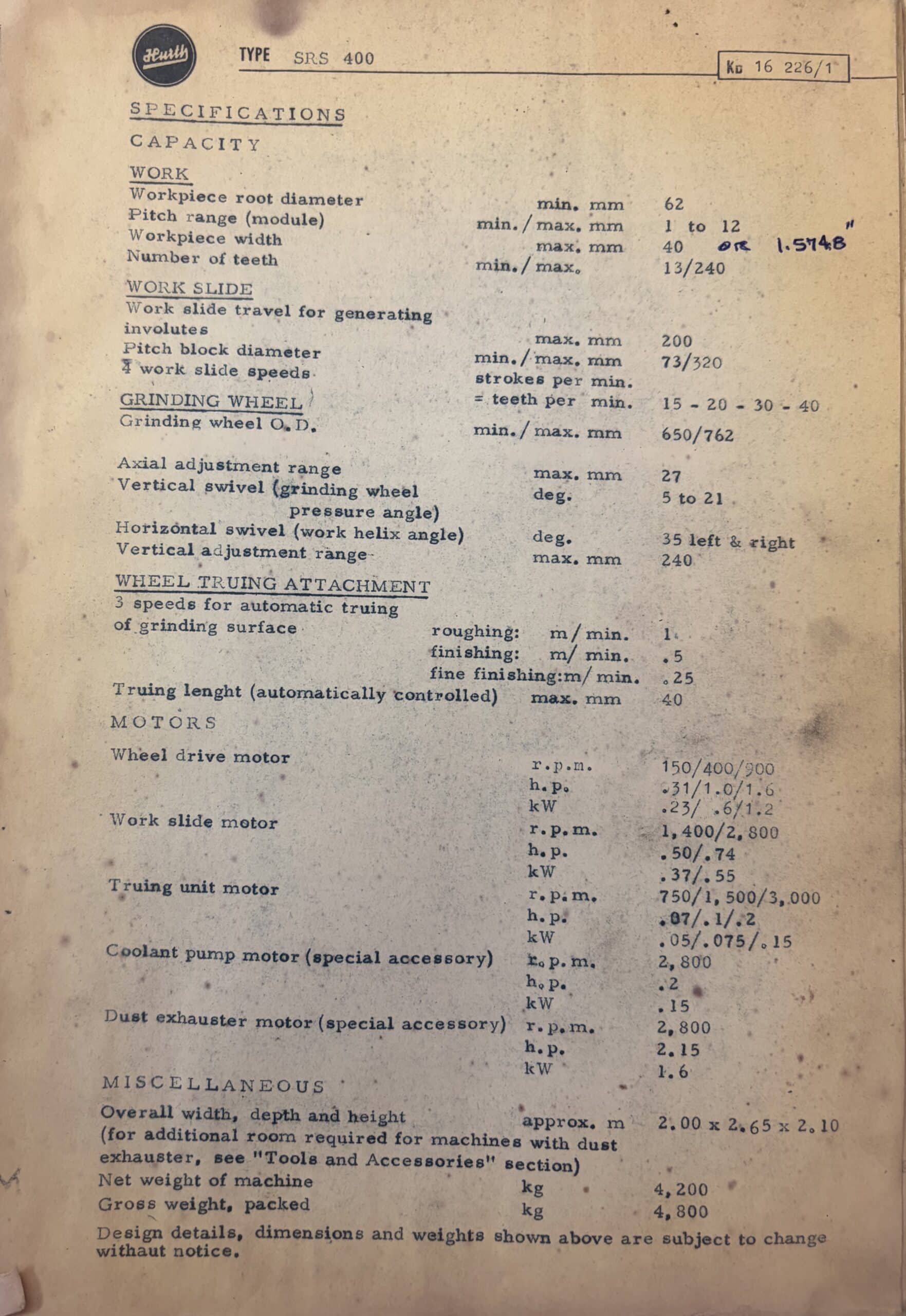 Hurth gear shaving cutter grinder and sharpening machine make in Germany, Excellent Working Condition with lot of accessories . Index Plates,Pitch Blocks, Roller Bands, Fingers,Spacers,Wheel Balancers etc. Orignal Product Manuals also available. Machine can be bought with accompanying HURTH SRS 400.